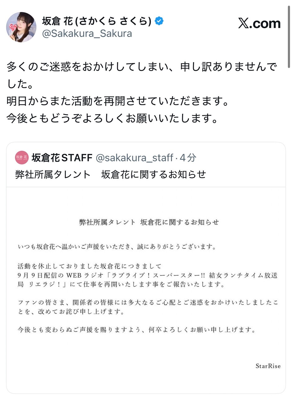 — 坂倉 花(さかくら さくら) (@Sakakura_Sakura) September 8, 2025