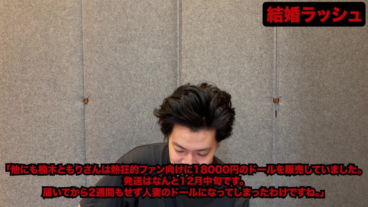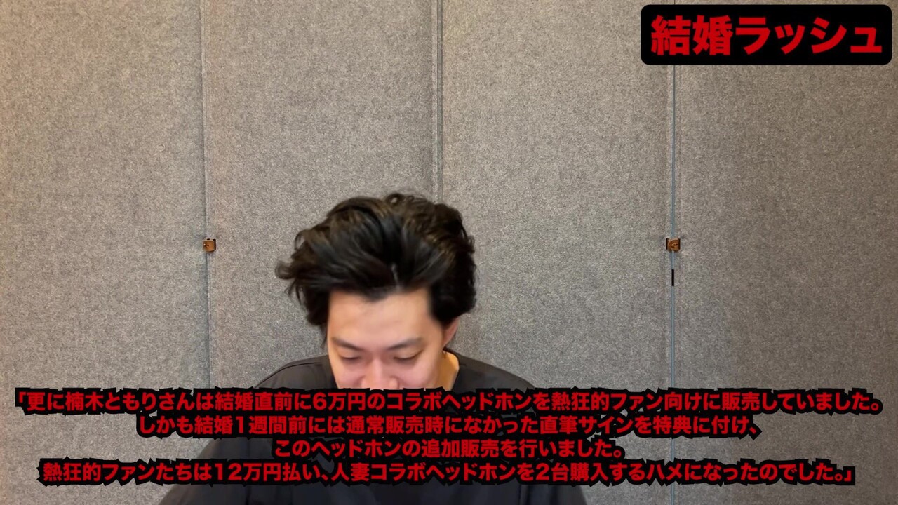 楠木ともりさんが結婚直前に高額なコラボグッズ(ヘッドホン等)を販売していたことに対し、ファンから「駆け込みで稼いだ」と批判がある点に触れました。